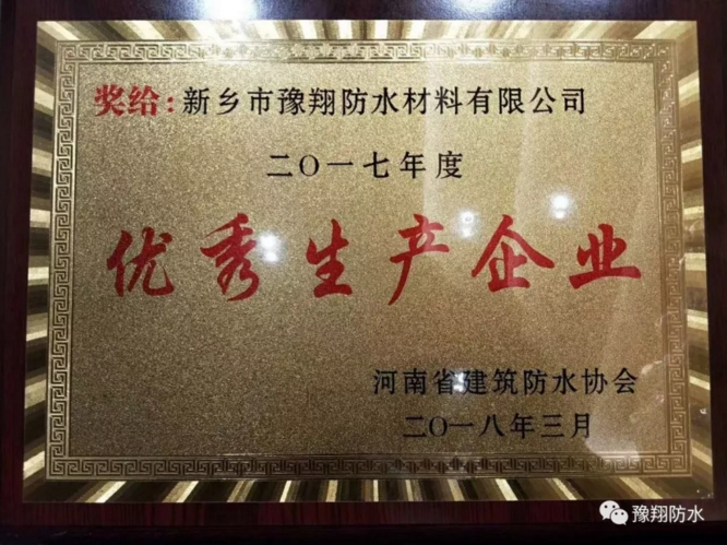 熱烈祝賀我司被<河南省建筑防水產(chǎn)品質(zhì)量提升大會(huì)>評(píng)為:2017年度優(yōu)秀生產(chǎn)企業(yè)獎(jiǎng)。
